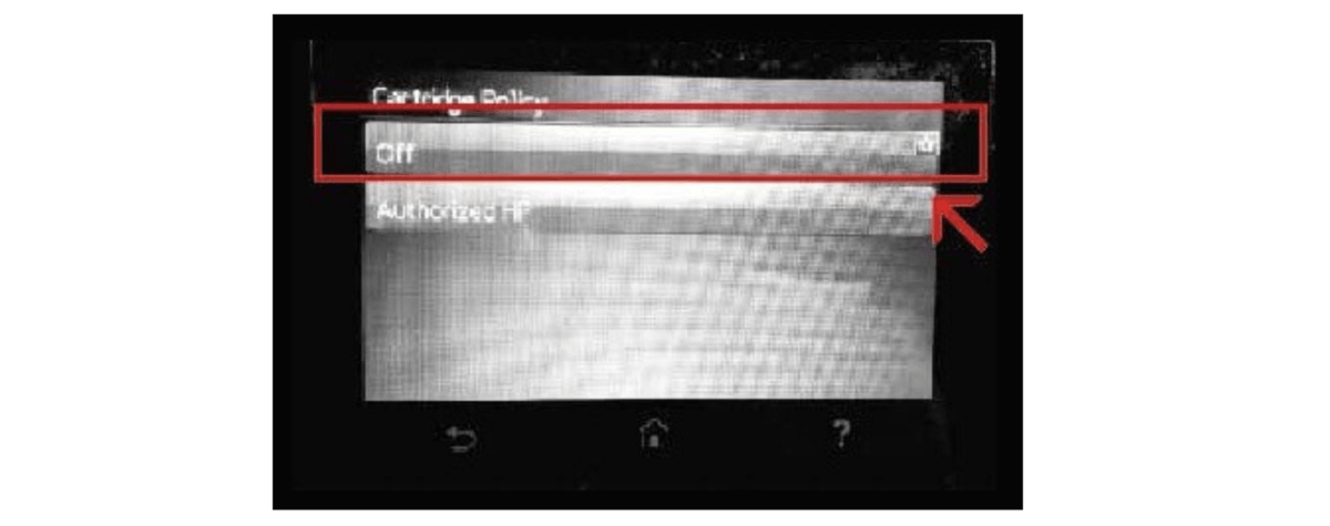 Step 5: To turn off the auto firmware update feature, go to Cartridge Policy and click “Off.” The printer should be restarted after this.