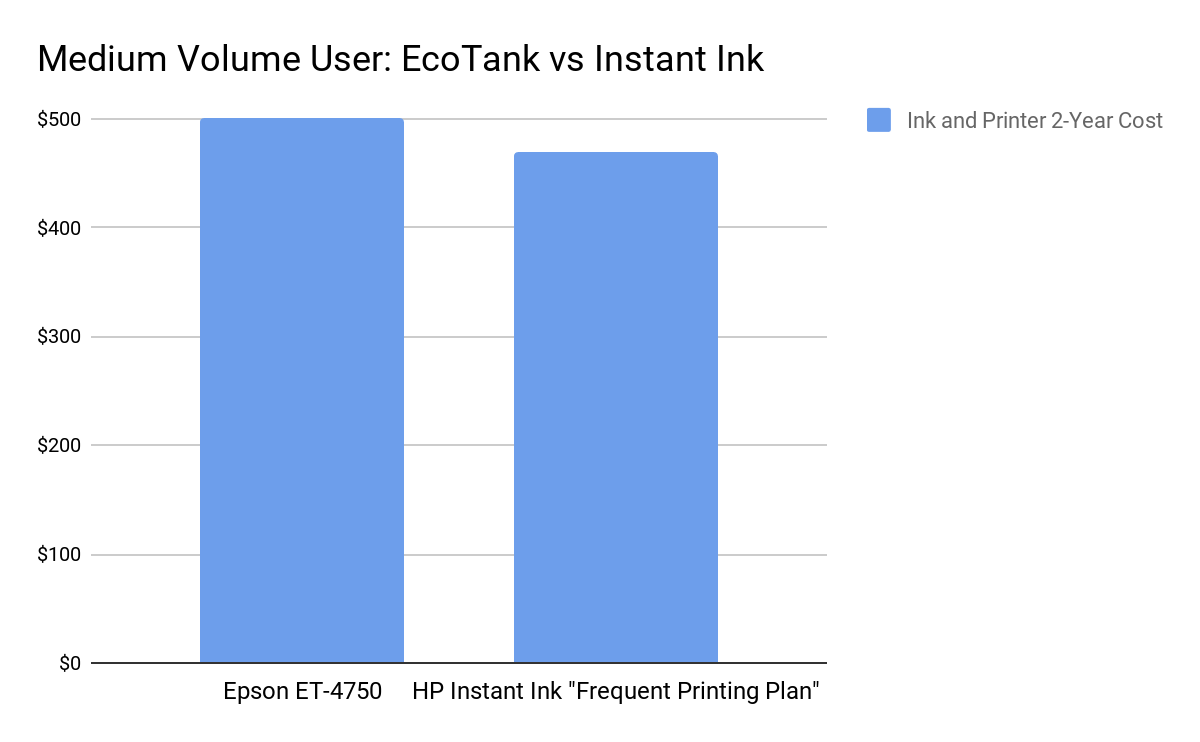 A printer similar to Epson ET 2550 is HP DeskJet 3755 (almost same printer speed and features), one of the HP Instant Ink Printers. It costs $59.99. Instant Ink’s “Moderate Printing Plan” allows 100 pages a month of printing for $4.99. In total, an HP user with a low print volume would have to a 2-year expense of $119.76 for the monthly subscription plus printer cost of $59.99, totalling to $179.75.