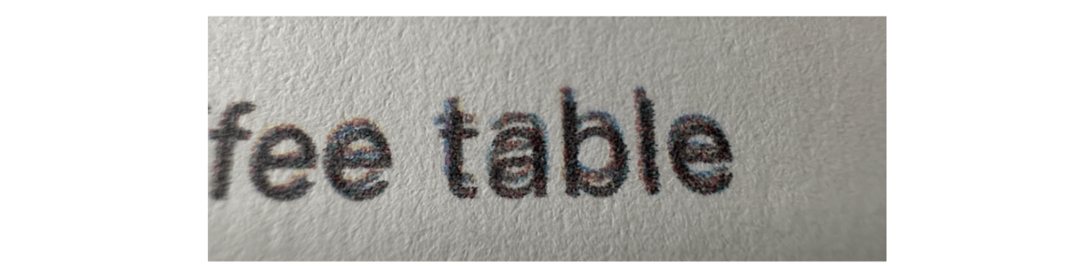 As we can see in the picture above, the print was meant to be black and white, but you can see a blueish color that looks like a shadow behind the letters. This happens because the printer uses some cyan ink along with the black ink.